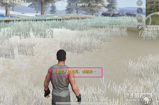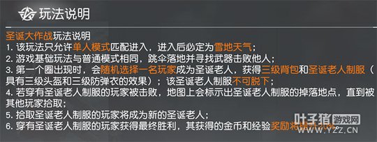 1.只允许单人模式进入,进入后必定为雪天天气; 2.游戏玩法与普通的一样,唯一的区别就是多了圣诞老人; 3.第一个圈出现时,会随机选择一名玩家成为圣诞老人,获得三级背包和圣诞老人制服(等于三级头和三级甲的效果);圣诞老人制服不可脱;