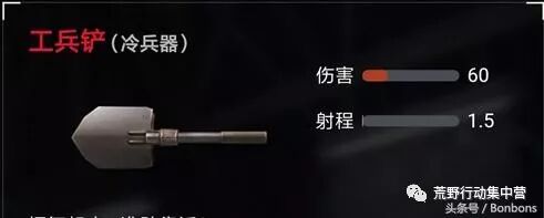 板砖 ◆获得方式:拾取、舔包。 ◆使用方法:使用时需要掌握技巧和时机,近战博弈不虚敌人,背后阴人好武器,防不胜防。 ◆优缺点:伤害高,适用于近战,攻击距离有限。 哇!伤害这么高!没怎么注意,岂不是被板砖拍两下就直接倒了,致命部位一拍即倒。可是我在实战中就没使用过,自然也就没有用这个杀过人,一般如果有工兵铲或者平底锅,我都会把砖头换掉。有两个动作,一只手握板砖拍的动作好带感,两只手的感觉这个拍的动作有点别扭。但不可否认伤害真的高! ●没杀过人系列之工兵铲: