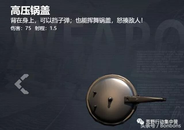 手枪 作为《荒野行动》中唯一的手枪,伤害和AK一样,但拿着这个心里总是没有信心,感觉力不从心,特别是遇到空手的敌人,有一点点压力,万一没打中一枪怎么办?万一被拳头打死,那可是无尽的嘲讽啊,感觉很丢人。 ●没杀过人系列之平底锅: