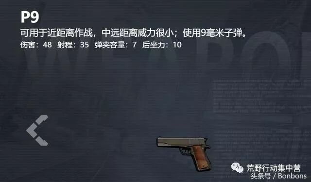 工兵铲 ◆获取方式:拾取、舔包。 ◆优缺点:近战武器中伤害最低,但攻击距离远,近战很有优势。 伤害低了点,但如果敌人拿着工兵铲冲过来还是很有威胁性的,感觉怕怕的,拍起来的动作很霸气,小编表示没用过这个武器杀过人,一般有平底锅,我还是会换平底锅。 ●手枪p9: