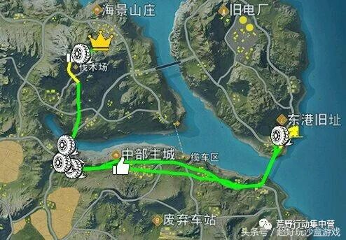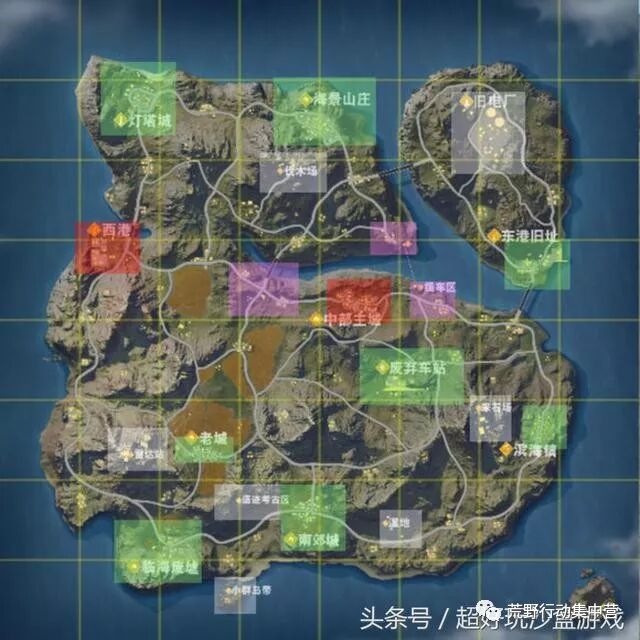 像红色的西港和中部主城是属于资源比较丰富的地区,而且人也多。所以如果无法熟练掌握刚枪的玩家们还是略过这两个地方吧,想练习刚枪的可以来这里,保准让你一个小时坐十次飞机。但是如果这两个地点不在航线上的话,可以落在公路上然后找车过来,这时候人就很少并且宝藏都是你的。 像紫色的地方是桥头等,一般第二个圈开始刷的时候大多数会过桥或者缆车,但是这里落的人也多,因为有车而且物资也够打一波的了。但是你可以在刷圈的时候过来蹲人守桥,有一次跟队友穷的什么也不怕的时候来了辆车坐了四个人,用仅有的子弹扫爆了他们的车变成了一波肥。