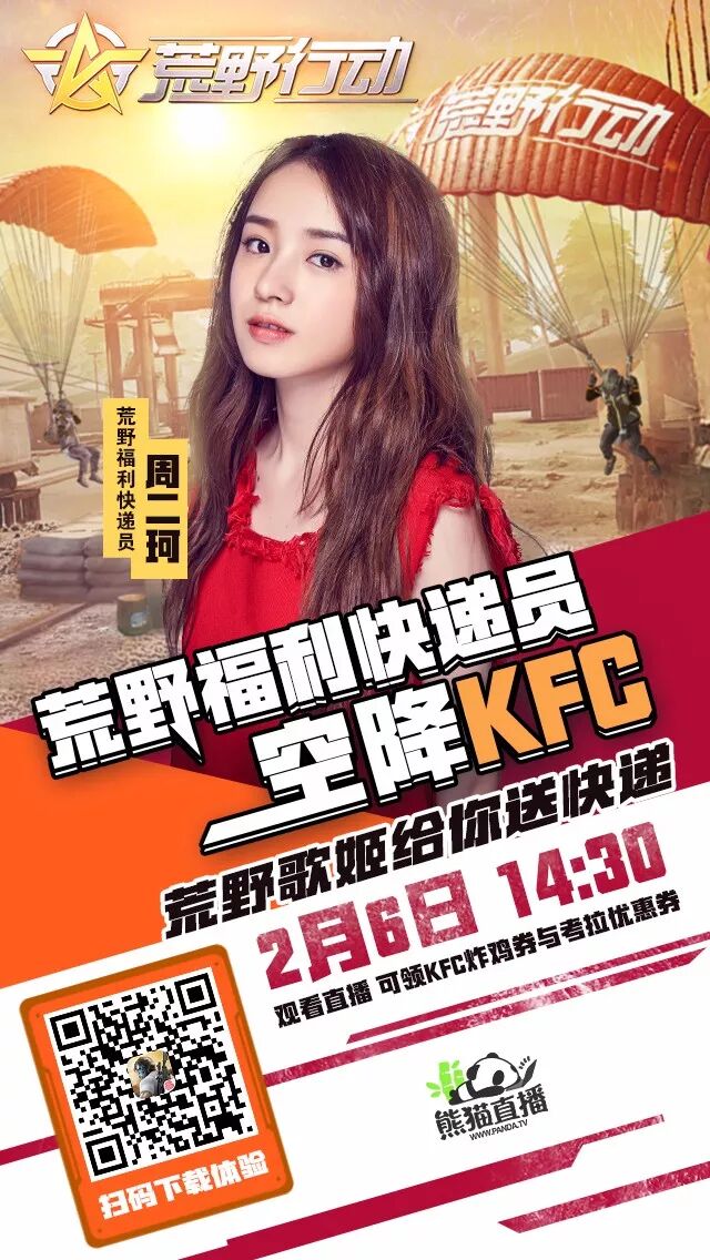 人气主播荒野歌姬 周 二珂 明天(2月6日)空降KFC 化身 荒野福利快递员 和你一起面对面打游戏