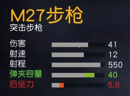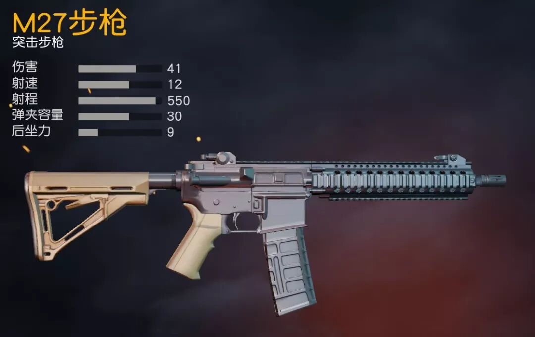 M27弹道相对集中,后坐力小,压枪也比较容易压,连续射击时,枪口不用移动太多,遇到敌人再也不描边了。