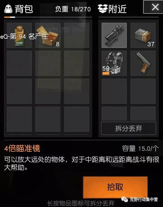 四:15倍镜 对于这个只存在于传说中的倍镜,很少有玩家见到,因为空投中也是有几率刷新的,而且大部分玩家都驾驭不了15倍镜的视野,一打开之后,完全是另一个世界,当你的身边有敌人的时候,打开倍镜简直就是一场灾难,所以如果拿到了15倍镜,就要选择尽量避开敌人,跑到一个他轻易无法瞄准的地方,打开你的15倍镜,就可以轻松的把对方身上的装备都能看清楚,然后一枪解决战斗,收工!当然,不是很推荐大家使用15倍,切镜的时候会很容易丢失视野。 看了这些,你对你的选择有没有 更清晰的认识呢?没有一个好倍镜,吃鸡都找不到方向了呢?赶快进游戏拿起你的武器,装上你的倍镜和敌人战斗吧!