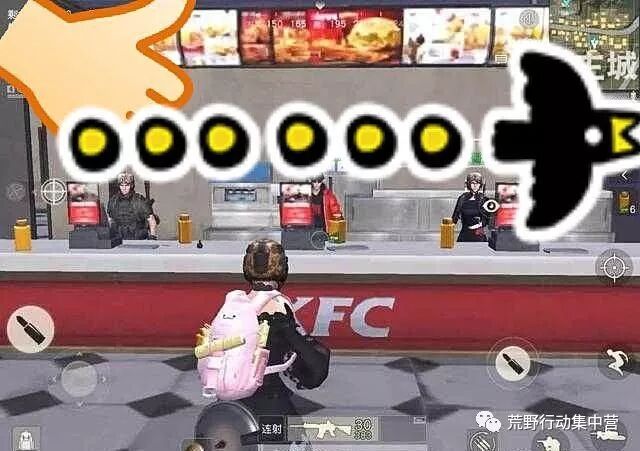 进入之后我是被他们三个吓了一大跳,只见点餐台上他们三个人笔直的站成一排,通通把枪背在身后,站在点餐机旁边,饰演了一把KFC点餐员……这种戏精队友真的是无药可救了,在哪里都能本色出演,我进去之后他们还在麦里问我:先生请问需要什么食物吗?……你们三个都背着枪,这顾客进来了哪敢点东西啊,不被吓跑就不错了!