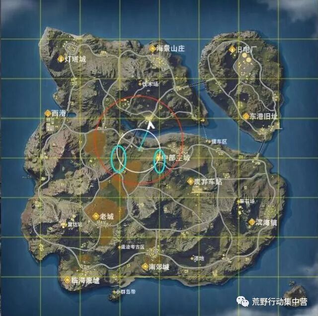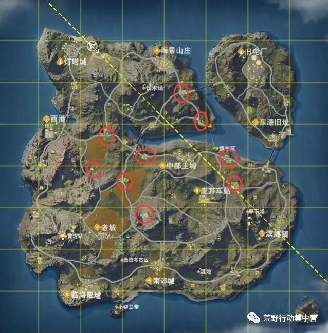 首先是开局落点的选择,这是很重要的一步。由于是单人组排,你面对的敌人肯定是复数的四个甚至是五个,所以落点的选择就变比其他时刻更加重要。拥有足够的物资并且能够灵活转移的落地尤为重要。图种标记的地方都是《荒野行动》物资刷新比较丰富,同时落的人比较少也容易跑路转移的地方。