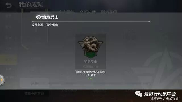 如果我能保证对手之间互相打减员,那又怎么保证最后一个对手被毒死呢?难道要放弃全身的枪支子弹然后捡一整背包的药品最后和敌人在毒圈里拼药? 5.绝地反击 这大概是《荒野行动》中最难的成就了吧,在单局中血量低于5%是战胜一名对手。一般情况下血量低于5%我就吓得苟在掩体后面大药了,谁还残血刚枪?当然也不排除头铁的,那真的是很胖胖哦~