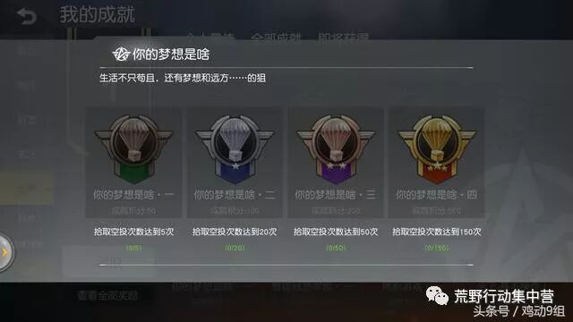 2.你的梦想是啥 这个成就也是相比于其他成就比较简单的,说白了就是拼命捡空投,但它比上一个成就难在哪呢?当一个空投落下来的时候,即使放眼望去它周围一个人没有,不要高兴得太早,敌人指不定在哪盯着你呢,你敢往空投方向跑,你可能连箱子都没摸到就被击倒了。