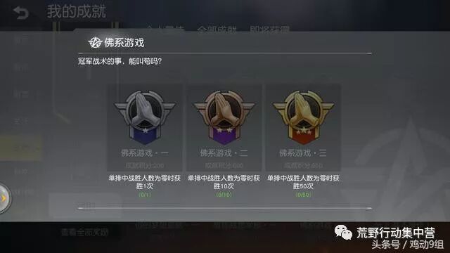 4.佛系游戏 单排时战胜人数为零时获胜。关键是这个成就不止一个,全部完成你需要50场单排都一个人不杀死获胜。这就意味着,你不仅要从头苟到尾,还要在决赛圈祈祷对手要么被别人打死要么被毒死然后你吃鸡。