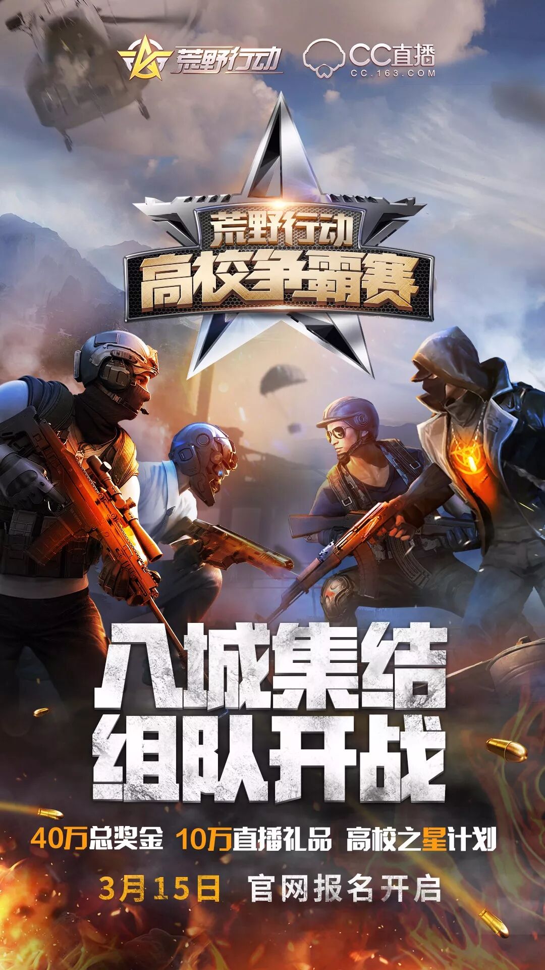 由网易荒野行动与网易CC直播 共同发起的首届 荒野行动高校争霸赛 于 3月15日 在官网开放报名!