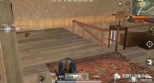 人们一般守楼的时候都会习惯蹲在二楼楼梯口附近守株待兔。虽然这的确会让你获得优势,但是作为攻楼的一方,在楼梯口转角处这些位置也是最警惕最小心的时候,大多数情况下对方都会先送你一颗手榴弹当做见面礼。