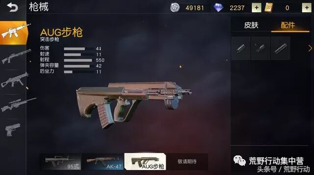 第一把进入空投中的步枪——AUG,拥有步枪当中最大的弹匣容量,而且自带二倍镜,伤害41。