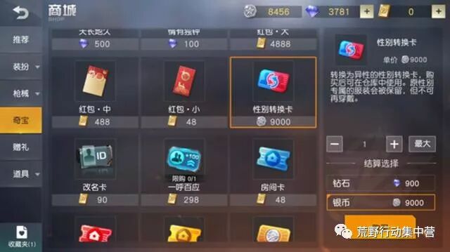 首先是女装大佬的体验,除去了外界开变身器等等的一些高招,其实在游戏里面也可以通过一些按键能够快速的达到伪装的目的。那么先开始准备工作,既然是女装大佬,一个女角色肯定是必要环节了,在商城里的奇宝环中,不需要消耗钻石和点券,只用9000银币就可以兑换性别转换卡了,可以说是非常实惠了。