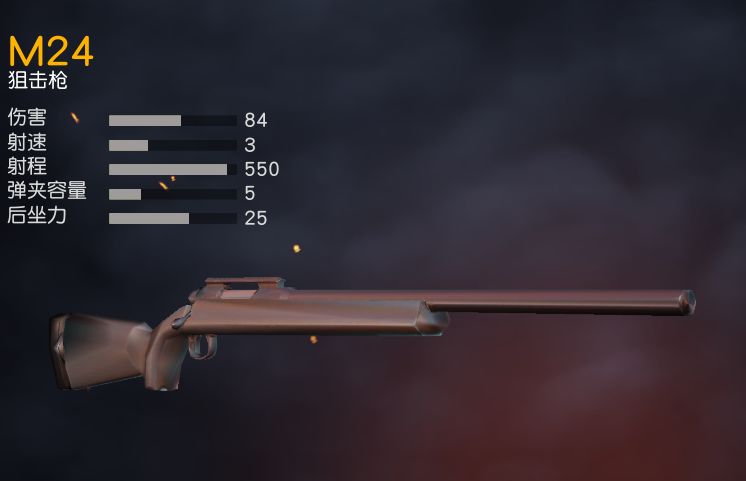 子弹型号 : 狙击枪子弹 伤害 :84 射速 :3 射程 :550 弹夹容量 :5 后坐力 :25