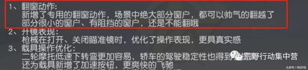 这次的更新当然不仅仅就破门而入这一点,除了门之外我们还可以破窗而入哟。 在之前的《荒野行动》中,虽然有一些比较矮的窗户我们可以直接跳进去,但是大多数的窗户由于高度的原因我们还是没有办法跳过去的,只能老老实实的开门进房子。 不过这次更新之后就再也没有这种烦恼了,游戏中增加了新的翻窗动作基本上只要是没有阻挡的窗户我们都可以翻窗而过了。
