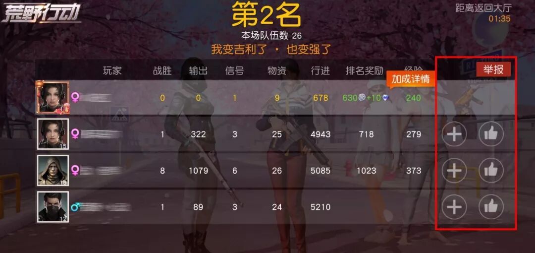 同时,我们优化了战斗 结算页面 ,添加队友为好友、举报不良行为、为队友点赞等都会更加方便,相信这样的机制会提高大家在组队模式下的游戏体验。