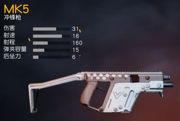 子弹型号 : 冲锋枪子弹 伤害 :31 射速 :18 射程 :160 弹夹容量 :15 后坐力 :6