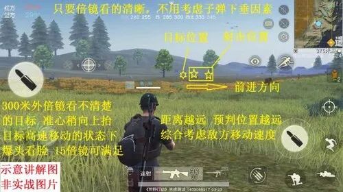 跟枪射击是狙击枪的另一大绝对优势,且拥有一定的操作难度。狙击枪远距离射击移动目标是需要很好的预判。这种预判主要是对目标距离、移动速度、子弹飞行速度的把握。大部分玩家也许还会考虑到远距离子弹下垂这一因素,在这里,鹏小杨很负责任的实战经验告诉你:只要能够清晰的看到敌方头部,准心红点瞄准即可射击。当目标处于移动状态时,通过对移动速度的把握,预判敌方行进位置向前瞄准对应的身位即可。距离越远,子弹命中略有延迟,这两个因素只存在300米外的情况。跟枪射击这种操作的确需要实战的训练才能够准确把握,也是最不容易掌握的一项技能。