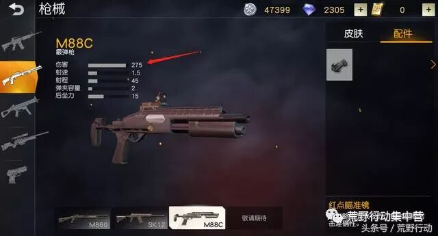 然后是最新上线的霰弹枪M88C,拥有荒野行动最高的伤害,高达275!它拥有特殊的换弹技巧,初始弹匣容量只有2发,如果开一枪再换弹能够填充到3发。而且,M88C是唯一能够装配红点瞄准镜的霰弹枪,开镜之后射击子弹还会更加密集! 十字弩