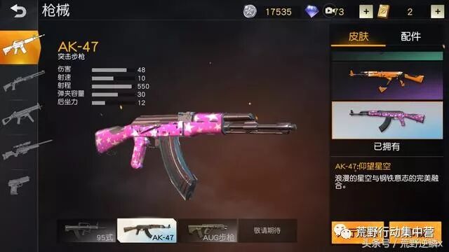 AK47AK47在现在的版本中属于伤害最高的一把武器,唯一不足的就是后座力太大也没有降低后座力的配件,导致了很多玩家选择伤害较低后座力更稳的武器。确实是有点可惜了!