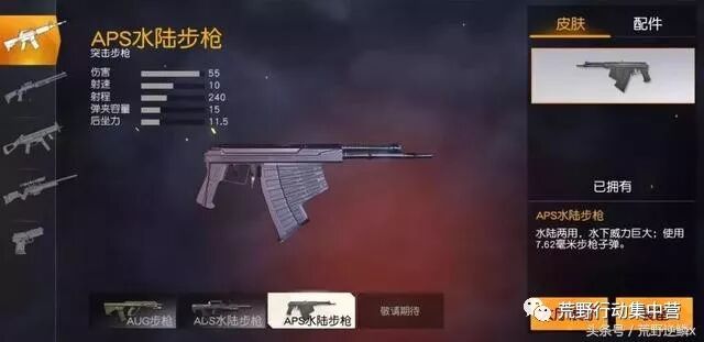 APS水陆两栖突击步枪这款步枪将会是更新后步枪类伤害最高的武器,伤害高达55,但是后座力也是挺高的,而且弹夹容量也只有15发,不过大家注意看,这把武器上有很多配件,相信在后座力和弹夹容量上也会改善不少。
