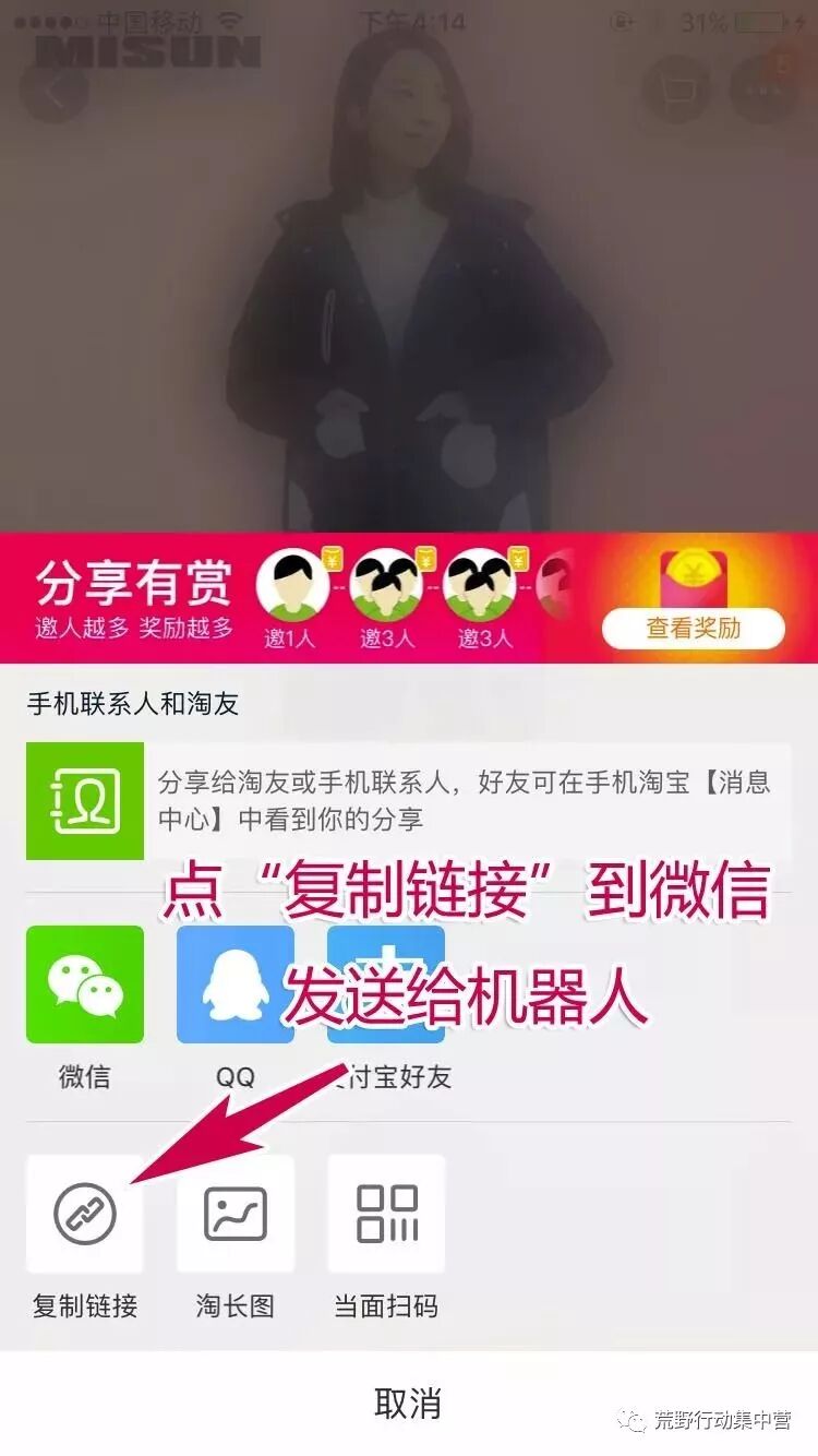 1、天猫或者淘宝上挑选好产品后,点击商品标题右侧的“ 分享 ”,然后点击“ 微信 ”或者“ 复制链接 ”,把复制的淘口令发给机器人。 (机器人会反馈回来一个有优惠券的链接,还是同一个商家,同一个商品)
