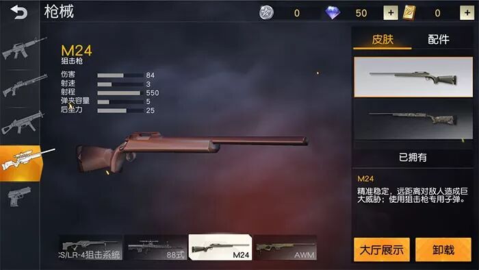 伤害中规中矩,除了在空投物资上获得之外,在荒野地图资源分布上也有少量刷新,很多“荒友”都非常喜欢拿M24狙击枪,小编不用猜都知道,除了性能上的优越之外,还有一个优点就是M24 开枪声音 非常好听。