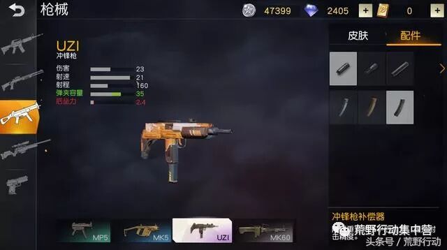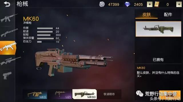第三名UZI,号称荒野行动“最快、最稳的枪械”,它拥有荒野行动最快的射速,高达21点,还有荒野行动最低的后坐力,满配之后仅有2.4。所以以后碰到UZI,千万别小看它,捡起来试试,说不定能发挥很大的威力噢~ Top2 :MK60