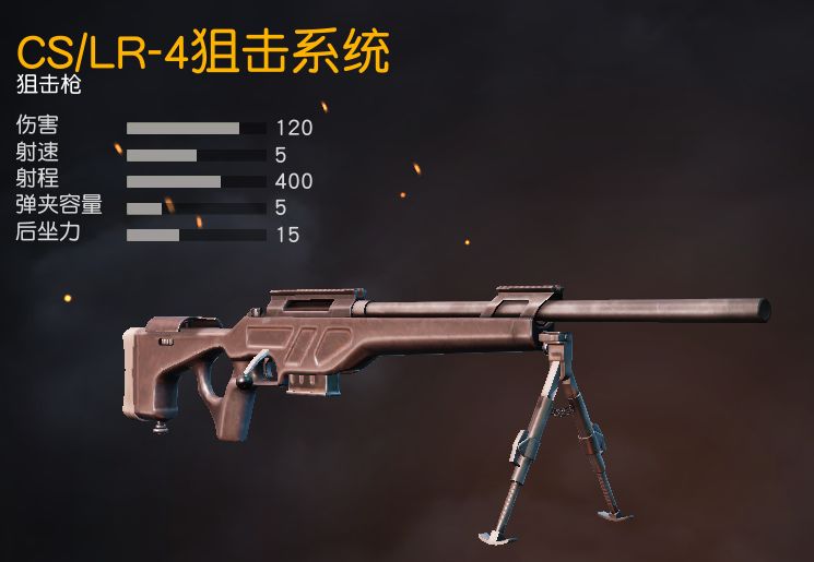 子弹 : 狙击枪子弹 伤害 :120 射速 :5 射程 :400 弹夹容量 :5 后坐力 :15