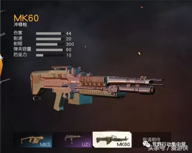 可以看出虽然两者同为95式系类,但是由于属于不同枪械种类,产生差别大。 95式轻机枪定位冲锋枪,射速快,不吃配件,上手既可以战斗,在前期装备匮乏时候,95式轻机枪明显比95步枪占有优势。 在中后期,装备起来,95式步枪反而占有优势,射程远、稳定性好、伤害高,最大弹夹容量达到65发,特别是后坐力和伤害在后期尤为重要,所以大部分玩家会选择95式突击步枪,属于《荒野行动》最具代表性的国产利器。 如果95式轻机枪与MK60比较谁更占优势呢? MK60: 伤害:44 射速:20 射程:300 弹夹容量:60 后坐力:10