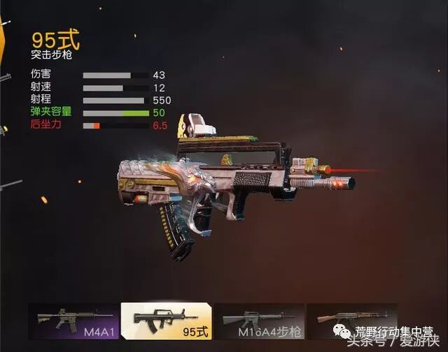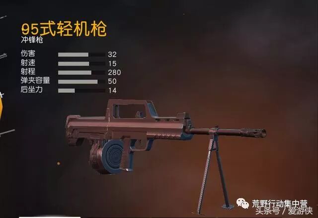 95式轻机枪属于冲锋枪类型,所以荒友们别弄错概念咯!射程仅为280(步枪为550),射程为步枪一半。可以装备全系列的倍镜,通用性还是挺强,在中近距离输出不俗,与95式突击步枪比较: 伤害:43 射速:12 射程:550 最大弹夹容量:65 最小后坐力:6.5