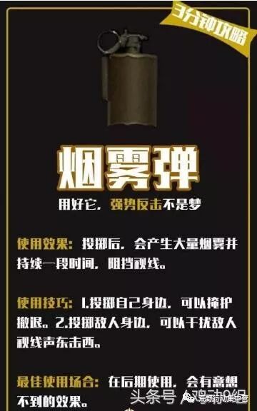 有些荒野萌新认为烟雾弹并没有手榴弹那样强大杀伤力,也没有闪光弹那样直接干扰性,所以路过烟雾弹是撇都不惜的撇一眼,你这是犯了吃鸡的大忌啊! 关于从烟雾弹的妙用呢,小编分以下几个方面来展开: 攻击时