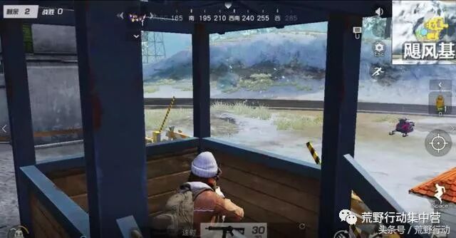 一进大门,眼尖的天命妹就发现了一处 伏击 的绝佳位置。荒友们正对着大门时可以留意一下,在你们的左手边有一个 两层楼高的 哨卡 。 各位精英们可以选择蹲守在哨卡里面的小亭子里,埋伏在这个地方基本上能控制住基地正门范围内的视野,可以伏击从正面进去的敌人。 靶场