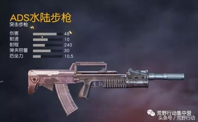 ADS水陆步枪 当然,同为水陆步枪家族成员的另一款新枪——ADS水陆步枪实力也不容小觑,在伤害与AK-47持平的情况下, 后坐力数值只有10.5 ,低于后者的12。