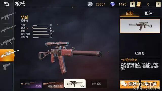 众所周知,一般的狙击枪都有着高额的伤害和和较慢的射速,但荒野行动最快的狙击枪——Val,它伤害仅有38,比步枪还要低。 如果因为这个你就看不上它,那你可能会错过一把神枪!Val虽然伤害低,但是却拥有步枪的射速,而且自带四倍镜和消声器两大强悍配件,让你在前期就能体验阴人的快感。 最快霰弹枪