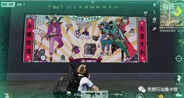 位于商场外部的围墙上也有像上图这样的巨型漫画。用中国风的元素描绘了荒野行动的实战场景,人物以及物品的风格也都非常的接地气,似乎想向人们传递荒野行动这款本土化风格的游戏特色。 以上就是狗子给大家带来的更新介绍以及游戏中不为人知的彩蛋,如果大家有什么新的发现,记得call我喔!
