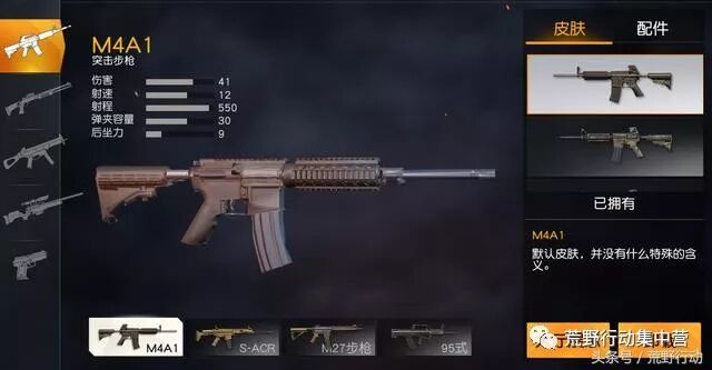 可以这么说,在刚落地时,M4A1是跟M27打成平手的! 我们可以看到,同样的41点伤害,同样的射速12,射程550,基础弹夹30发,无配件情况下后坐力都为9。 其实也就是说,当M27在无枪托无握把的情况下,与M4A1的属性其实是一样的,所以各位小伙伴平时在游戏中,如果没有拿到M27,也不妨先拿着一把M4A1,其实它能跟步枪之王M27在前期打成平手喔! 更重要的是,小伙伴们落地时捡到M4A1,看见敌人拿着一把M27,千万不用怂,跟它刚枪吧!我步枪界老兵M4A1可不怂你刚落地的M27!这可能也是M4A1最光辉的时刻,在落地的时候,它跟步枪之王M27打了个平手!