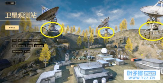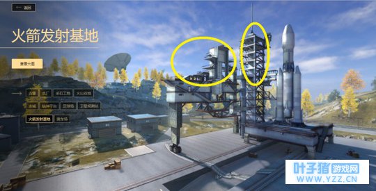 身怀壮志凌云飞,耀显华夏骄傲心。火箭发射基地是全图最为宏伟壮观的景色,地形复杂度程度一般,物资分布相对分散,玩家搜集物资很容易出现在无掩体的位置。上图黄色圈内的火箭发射架位置是此区域的制高点,视线广阔,且拥有不少物资,更便于躲避防守,可作为落地点,也可作为狙击点。作为落地点一定要把握好飞行操作,否则掉下来会直接GG。 四、卫星观测站