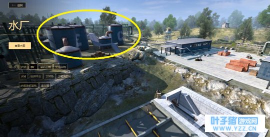 放眼望去布局合理,高大宽敞排列有序。水厂是这几个地点中,面积最大,物资最丰富的地域。这片地域的地形地貌复杂,障碍物也是最为奇形怪状的,各种厂房、管子、集装箱和大池子。由于地图较大,固定的一个蹲守狙击点当然是不能掌控全厂的,不过小杨推荐的这个地方绝对是最骚气的。上图黄圈内的储水桶位置,通过爬水管的方法可以登顶,此处地势较高,视野开阔,趴下敌方看不到,不过爬水管的时间还是比较长的,要小心周围的敌人! 八、钻井平台