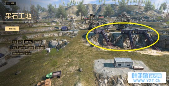 大海辽阔一望无际,钻台霸气巍然屹立。钻井平台是全图唯一的远离陆地的地域,钻井平台相当大,能够满足两到三人的需求。平台内部结构多层,听声辩位真的很难。上图黄圈内位置为钻台最高点,可观察船上的一切敌方动向,此处拥有物资,适合落脚,狙击蹲点也很方便。此外想要离开钻台只有载具和游泳。想到什么没有?没错,在钻台中央位置的水域有刷新的载具,蹲载具等人也是很好的选择。 九、采石工地