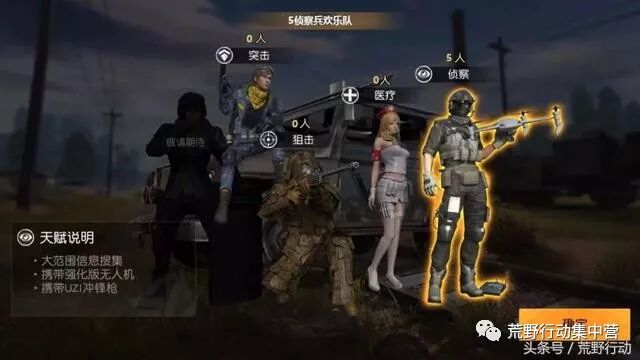 医疗兵提高了个人更多的续航,和更大的背包。无数的药和子弹装备在身上,没有任何心理负担,只需要稳定发挥自己的实力! 这种阵容搭配的缺点就是落地没有 武器装备 ,落地 成盒概率 很大,同时非常考验个人操作,没有其他天赋的伤害加成,作战能力稍弱,所以选择这一组合,就需要操作基础更强的队友。 如果你的队友恰巧都是大神,那么5医疗兵简直是个梦魇般的存在, 打不倒击不跨 ,有战斗力有配合有战术。同时5架救援无人机也可以用作侦察和吸引火力。 荒弟特别推荐——5侦察兵欢乐阵容5个侦察兵 是什么级别的阵容呢?