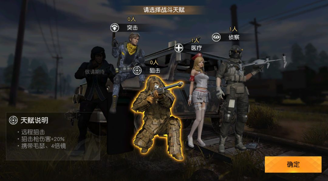 2. 目前开放了四种战斗天赋,侦察、 医疗、 突击、 狙击,给玩家带来特色属性、道具加成。