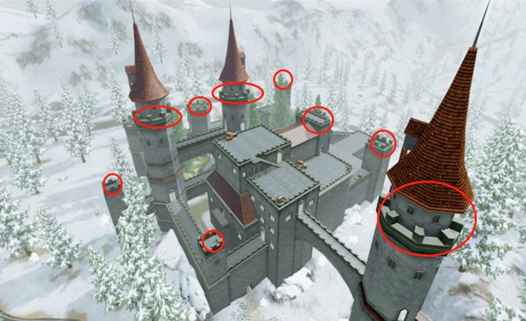 古堡四方有多个塔和哨岗。这些都是只有跳伞才能到达的地方,地势高、有掩体、视野宽阔,是狙击手的 最佳选择 !