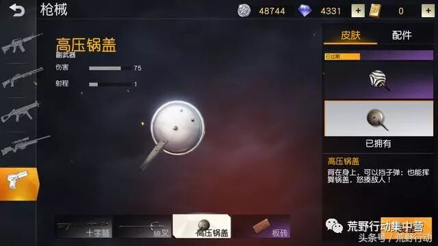 (图片来源于网络) 高压锅盖是荒野特有的冷兵器,不仅能攻击,还能挡子弹,可以说是非常强了!当你在煮饭的时候看到了它,是不是也有把它挂在身后的冲动? 集装箱