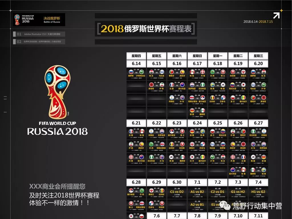 2018 年世界杯将于 6 月 14 日至 7 月 15 日在俄罗斯 11 个城市的 12 个球场举行有 32 个球队参加,总共 64 场比赛历时 32 天,有 25 个比赛日。其中,有 23 个比赛日在北京时间黄金时段有比赛( 24 点以前的第一黄金时段和第二黄金时段)涉及 37 场,包括揭幕战和三四名决赛以及决赛。距离俄罗斯世界杯开幕还有最后一周,四年一度的全球狂欢就要拉开序幕是时候收藏世界杯赛程表啦!