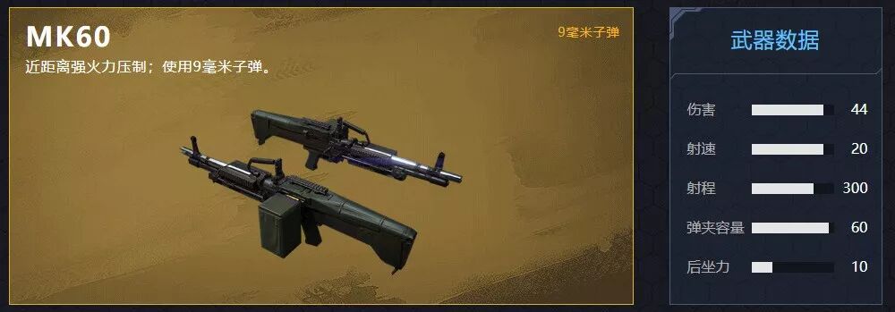 荒野大陆上唯一一款伤害值能与步枪抗衡的冲锋枪,只有我们的 MK60 了!它的射速位于荒野大陆所有冲锋枪的第二名,并且最最重要的是 ,它的射程为300,几乎是其他冲锋枪射程的两倍,并且初始的弹夹容量就有60。