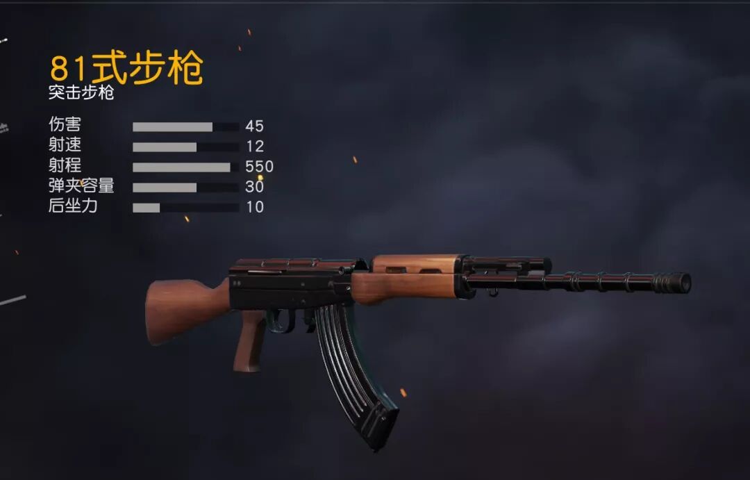 81式步枪 单从外观看比较普通 ,可是它的威力一点都不低!45的伤害值,属于荒野大陆所有步枪的中上游水平;射速和射程也是荒野大陆步枪中的最高水准;它的初始后坐力也只有10,配备步枪补偿器后可减少至8.5,所有数据综合来看都非常优秀!