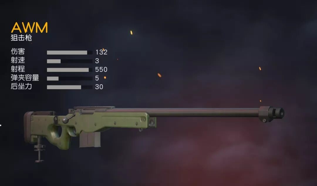第一个当然得是我们的“信仰之枪”—— AWM !先来看看数据,它的 伤害值高达132! 它可是荒野战场上伤害值最高的枪械, 这个伤害值几乎是毛瑟狙击枪的两倍。伤害值高的同时,其他性能也毫不逊色,射程远,达到了550;后坐力也在合理范围,配备狙击枪补偿器之后后坐力只有24。