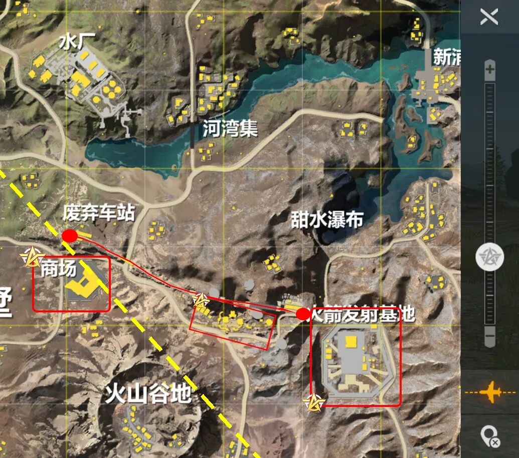 荒野小火车在 废弃车站 与 火箭发射基地 之间往返,周围山体较多,地势较为复杂。附近主要的物资点有: 商场 、 火箭发射基地 以及中间的一片 建筑群 。