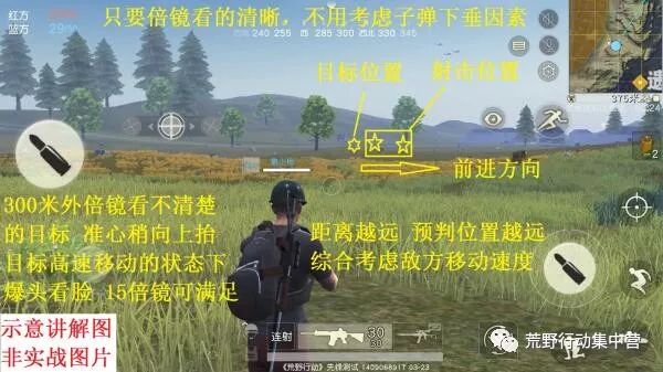 4、当目标处于移动状态时,通过对移动速度的把握,预判敌方行进位置向前瞄准对应的身位即可。距离越远,子弹命中略有延迟,这两个因素只存在300米外的情况。跟枪射击这种操作的确需要实战的训练才能够准确把握,也是最不容易掌握的一项技能。 最后,大家一定要记住:一个狙击手的所具备的特质,不是单纯的打的准,更多的是发现寻找机会淘汰对手。再次感谢各位帅哥靓女的阅读,接下来坐等各位秀出神评。